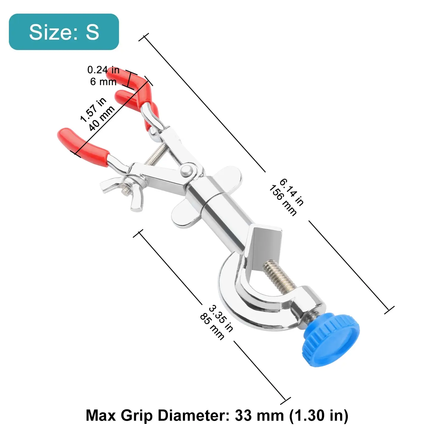 - Jaw design: three-prong rubber-coated jaws provide slip-resistant contact for glassware and fittings